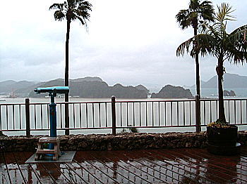 | 日南市から宮崎市に入ってすぐに堀切峠トンネルがある。その手前を右に入り旧道の国道220号線を少し走ると、日南海岸の高台に道の駅「フェニックス」がある。この道の駅の展望台からは日南海岸の絶景が観望できる。当初はここで車中泊のつもりだったが、夜間はかなり寂しそうなので先に進むことにする。 |