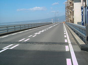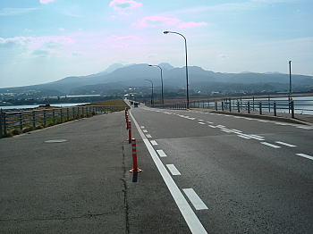 | 島原を発ち国道207号線を長崎方面に向かう。諫早に入り少し走って島原方面の案内標識で左折して、諫早湾干拓堤防道路を走る。諫早湾干拓堤防道路は干拓事業の潮受堤防上に構築した道路で、諫早湾を一直線に走り、長崎県諫早市高来町と雲仙市吾妻町とを結ぶ。 |