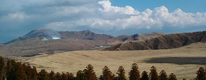 阿蘇には午後2時30分頃着く。阿蘇山には平成9年の夏に友人と訪れたことがある。この時はお盆の休日で道路は大渋滞だったが、今回はオフシ−ズンでもありスムースに走れた。阿蘇山を登り噴火口に向かう料金所で喘息等の病気はないかと聞かれる。きょうはガスが発生しているので、近くの駐車場までは行けるが、噴火口には近寄れないそうだ。仕方がないので駐車場近くの展望台から、もうもうと噴煙をあげる噴火口を展望する。 |