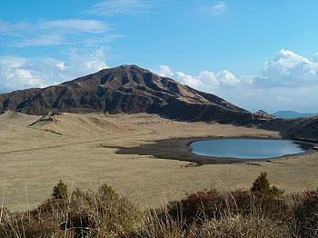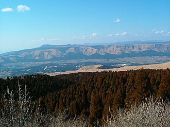 | 噴火口方面を望む。夏に来たときには緑の絨毯を敷き詰めたような青さで牛が放牧されていて牧歌的な風景だったが、冬の阿蘇山は茶褐色の荒涼とした風景だ。 | |