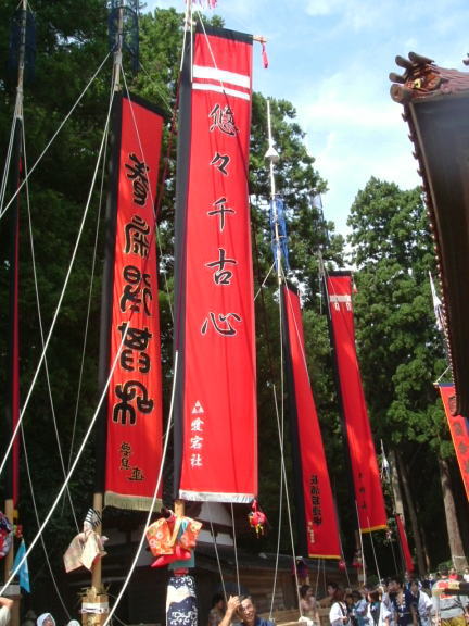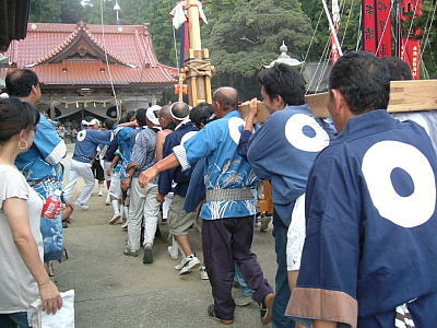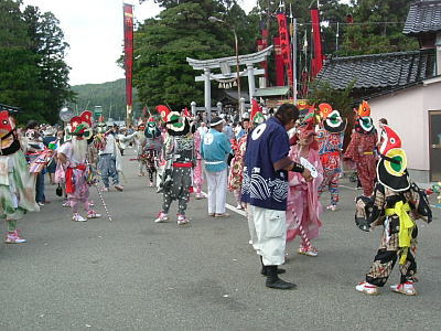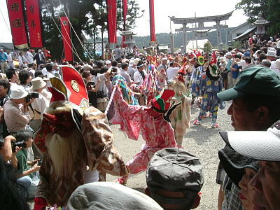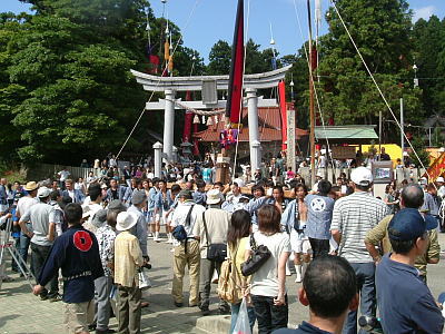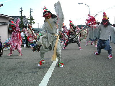 | 国の重要無形民俗文化財に指定されている奇祭。 七尾市中島町の久麻加夫都阿良加志比固神社(熊甲神社)の大祭で毎年9月20日に行われることから”二十日祭り”とも呼ばれています。猿田彦の先導で、高さ20メートルばかりの深紅の大枠旗やお道具を従え、「イヤサカサー」の掛け声と鉦・太鼓の音も賑やかに、本社に参入します。 |
