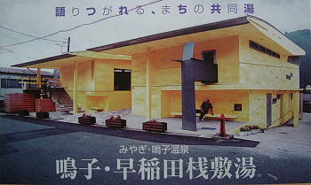 | 鳴子・早稲田桟敷湯 昭和23年、早稲田の学生が地熱開発ボーリング実習で掘り当てた温泉なのでこの名前がつくそうです。 源泉掛け流しの透明で湯ノ花が舞う温泉らしお湯。多少硫黄臭がした。朝風呂のせいか、流し場がちょっと寒かった。 営業時間:8時30分〜22時 利用料金:大人530円、小人320円 泉 質:ナトリウム-硫酸塩泉・塩化物泉 低張性中性高温泉 |