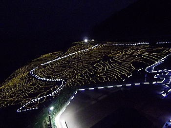 | 千枚田の夜景 2018年10月13日から2019年3月10日まで。暗くなると自動で点燈し約4時間イルミネーションの夜景が楽しめる。 2色に変化する。 |