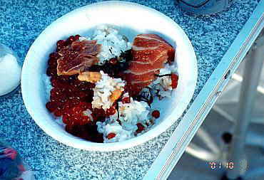7日の早朝、k,kimuraさん手製の海鮮丼で朝食中の所を、運良く通りかかりご馳走になりました。